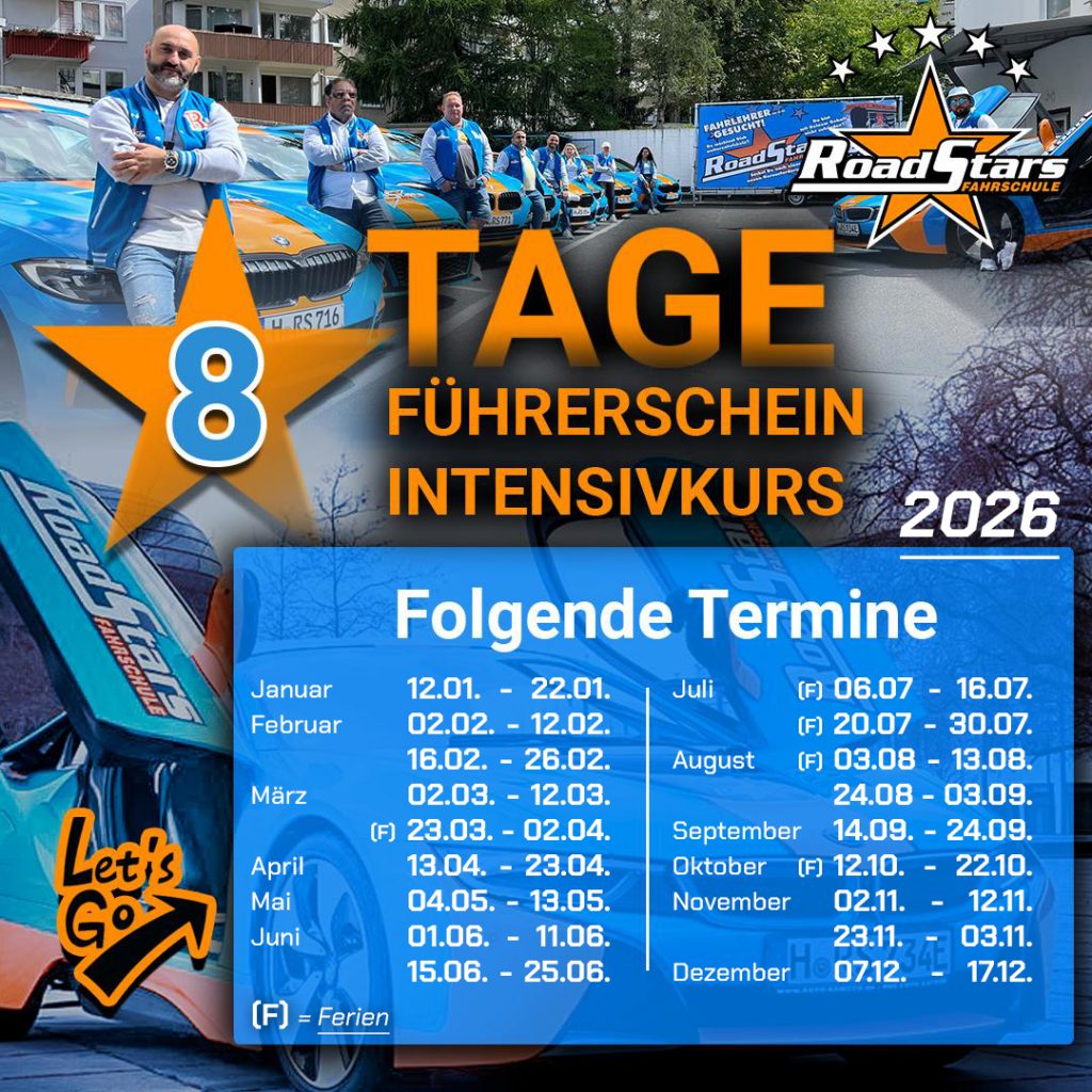Die Intensivausbildung mit der Fahrschule Road Stars eignet sich für alle, die gern Zeit sparen und ihren Führerschein besonders schnell machen möchten. Voraussetzung ist, dass du dir die erforderliche Zeit freinehmen kannst.